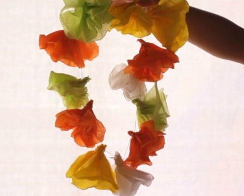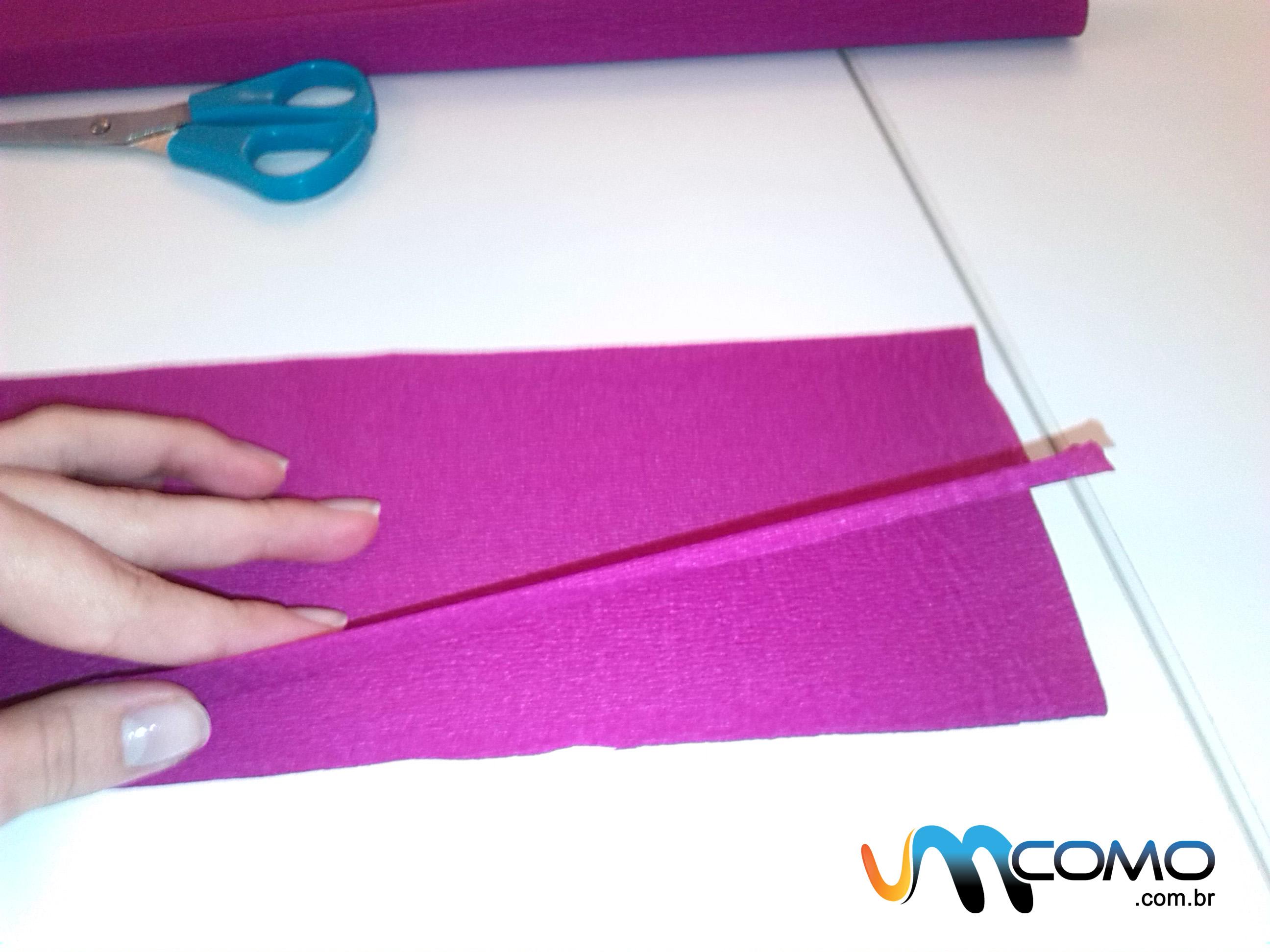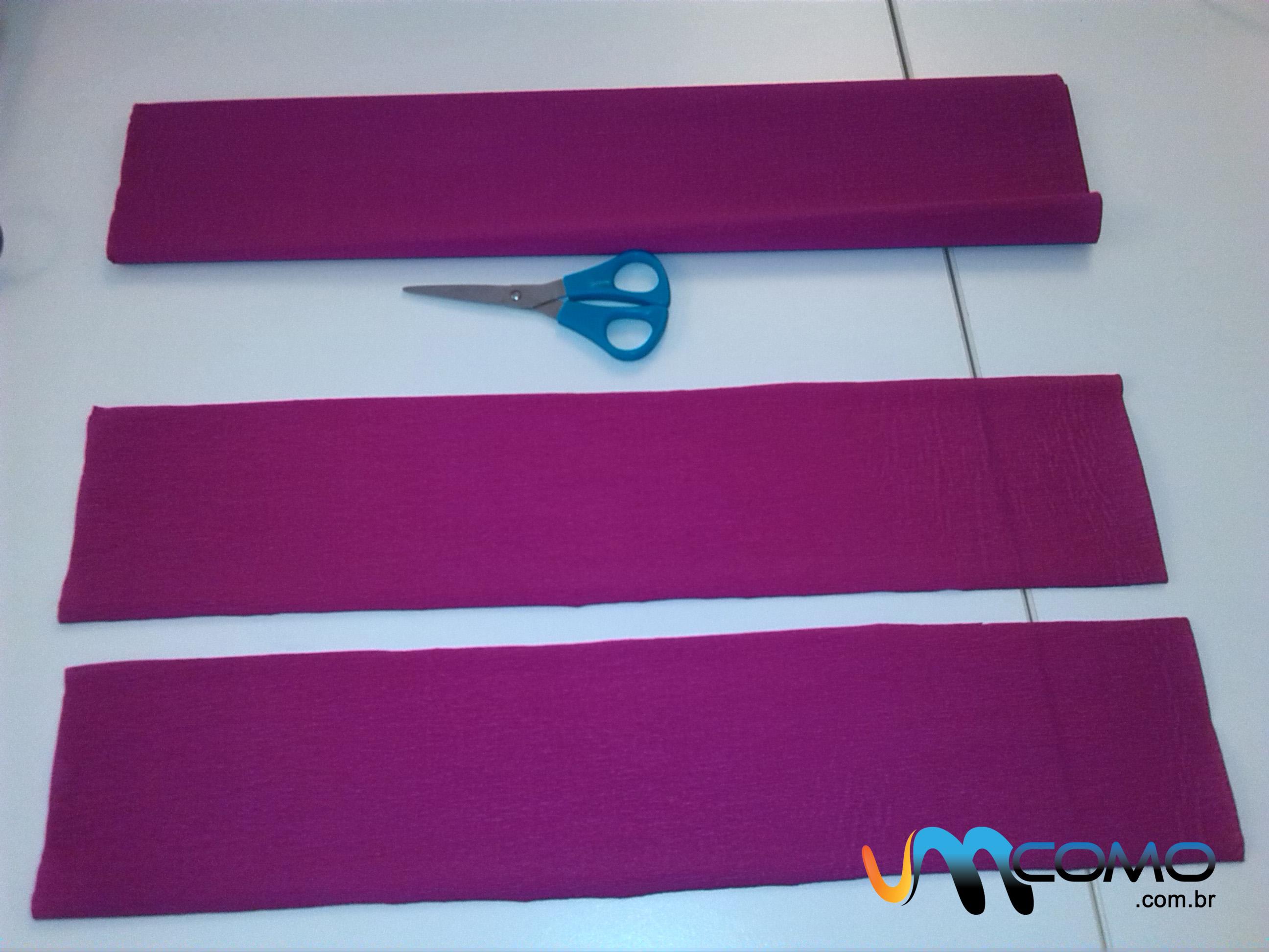 Para fazer um colar havaiano deve começar por cortar o papel crepom em tiras de aproximadamente 12 cm de largura. Para cada flor deve utilizar 2 tiras de papel crepom.
