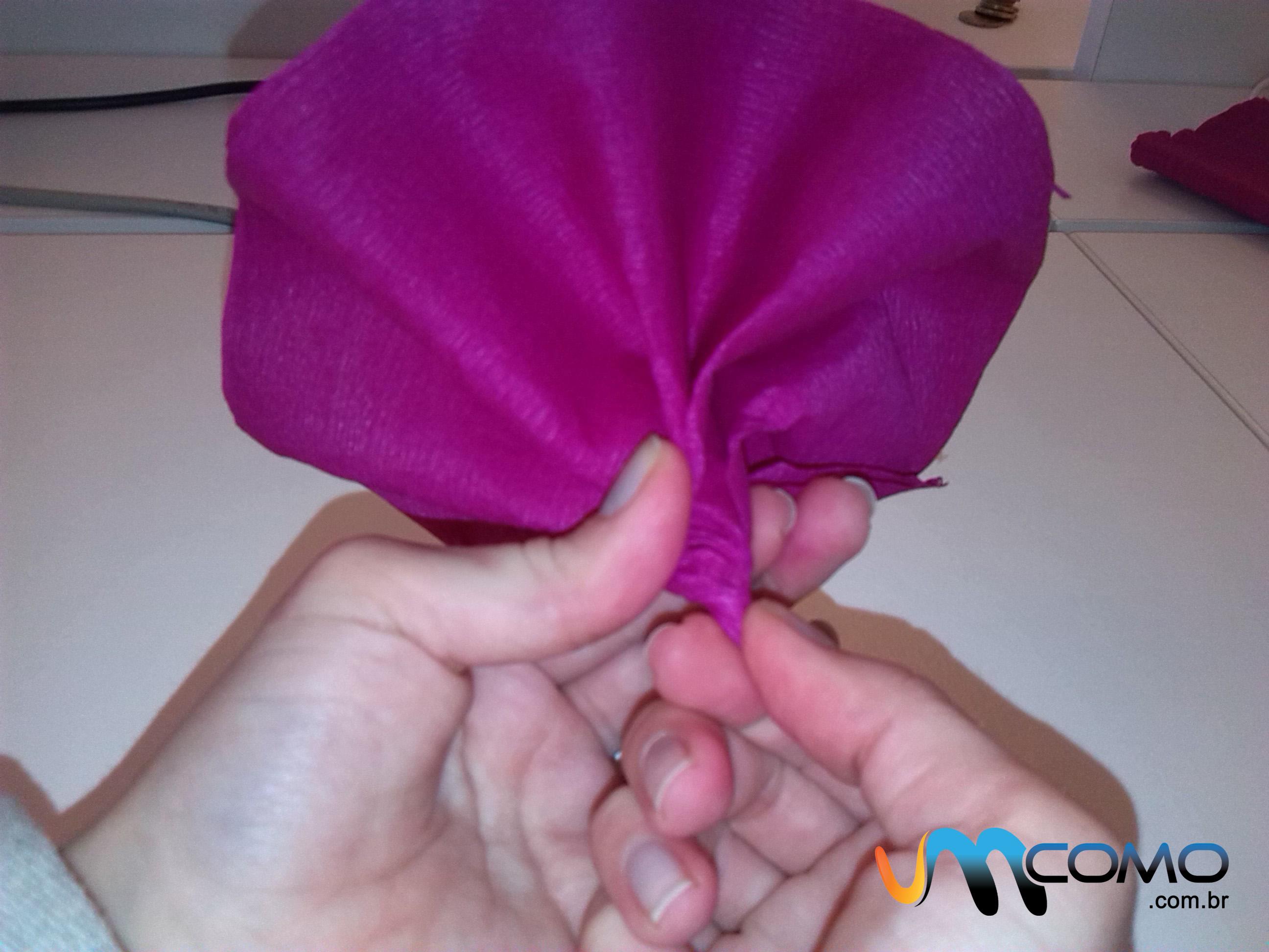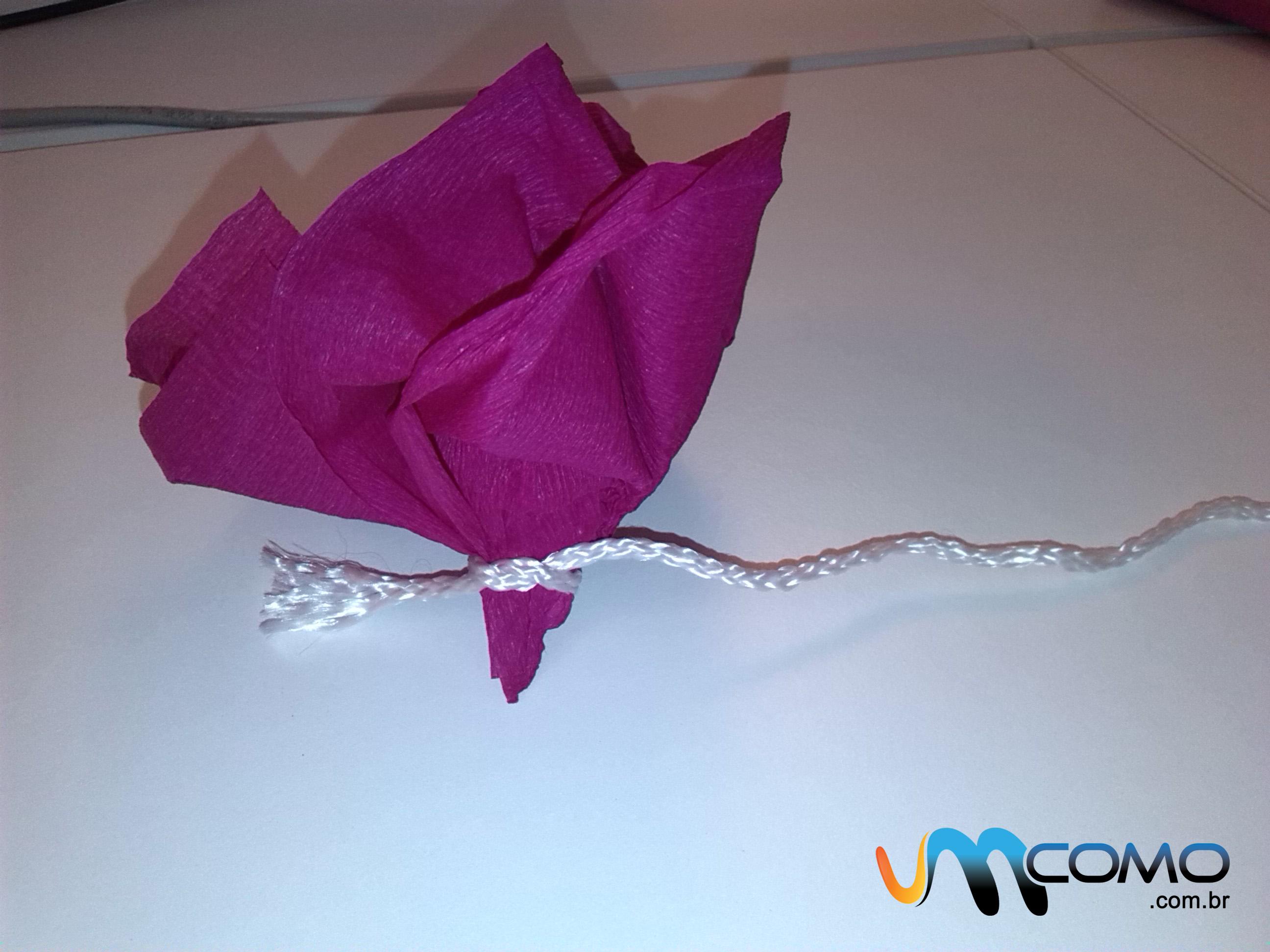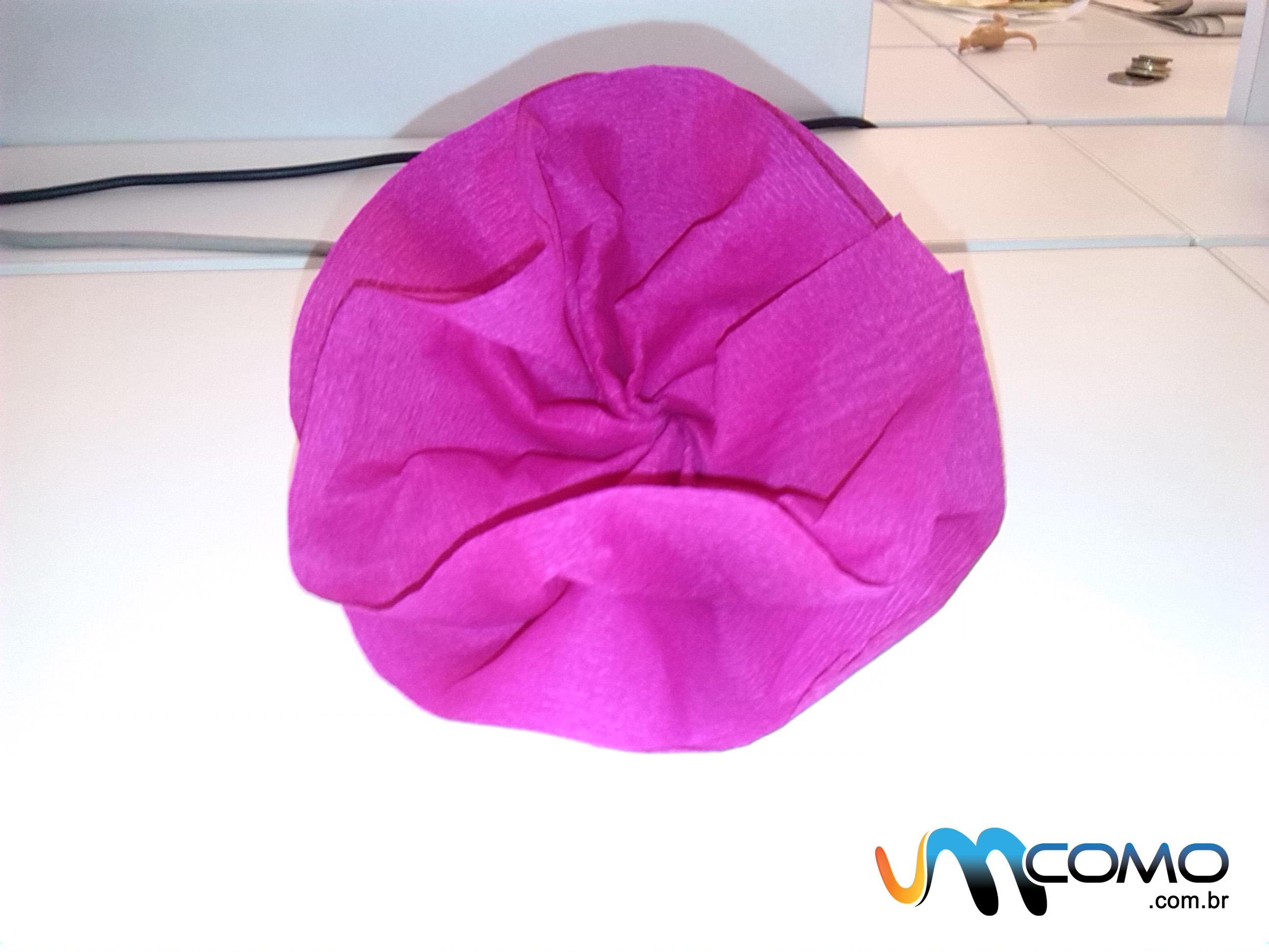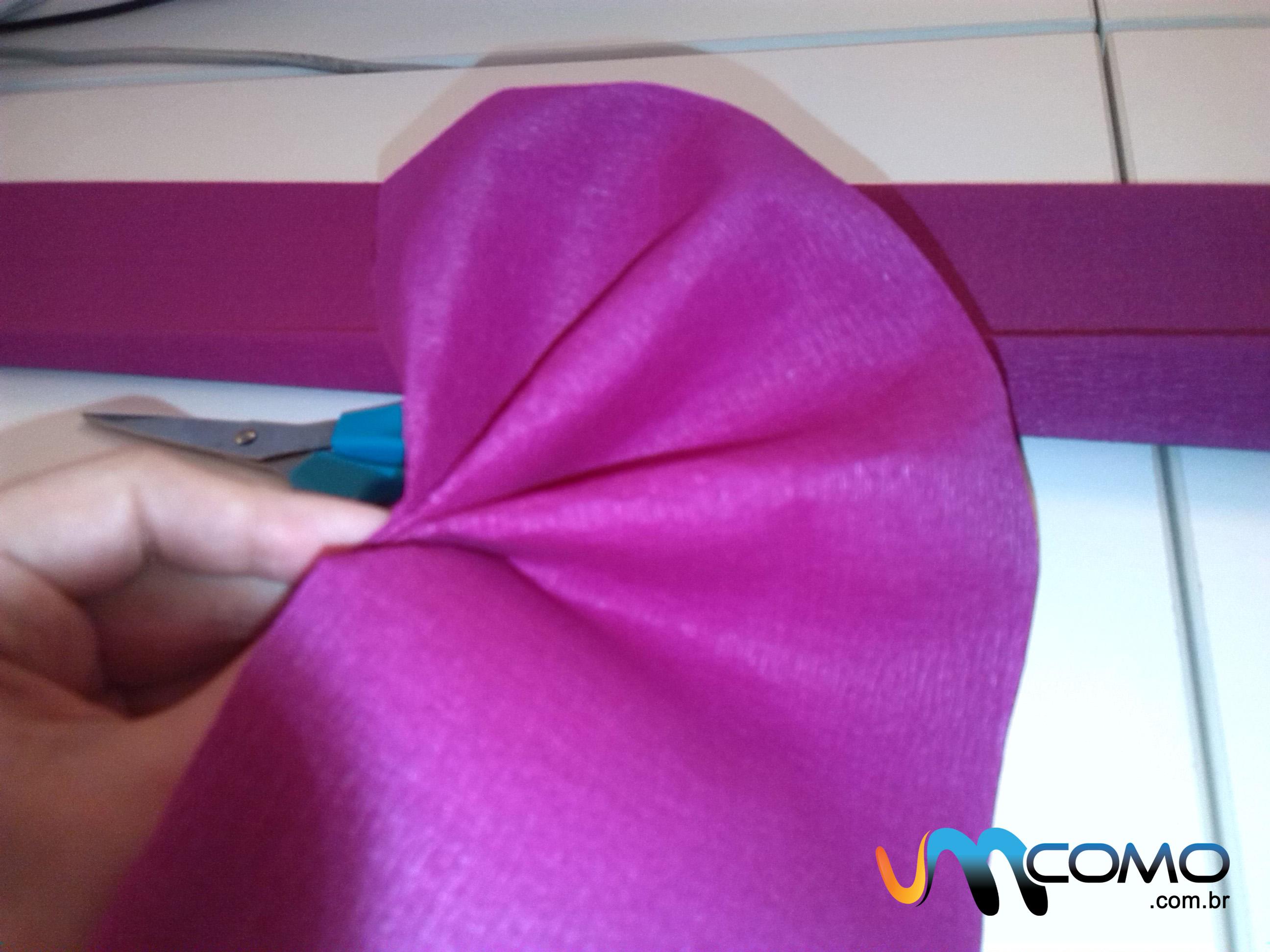 No fim de ter feito as dobras, segure a ponta de baixo da flor e gire para ficar segura. Depois abra as flores, separando as duas tiras de crepom, até ficar com um formato semelhante ao de uma flor.