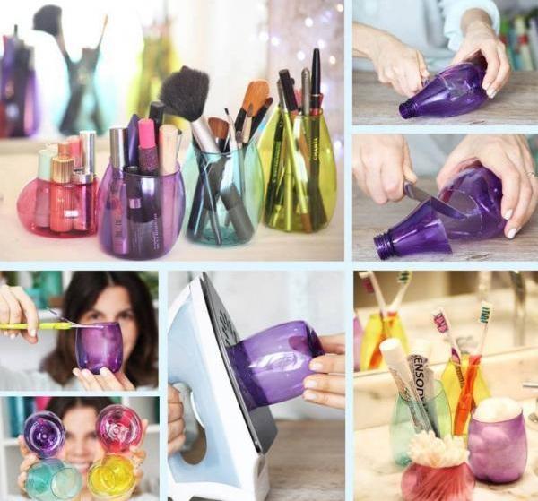 Para isso pode usar diferentes tamanhos de garrafas de plástico que serão adaptadas aos utensílios que quiser guardar no seu interior. Para conseguir que o plástico não corte, é importante que quando cortar a garrafa você forre o corte com um tecido ou algo similar ou, se preferir, pode fazer como mostramos na foto: aplicando o calor de um ferro conseguirá eliminar o corte da garrafa.