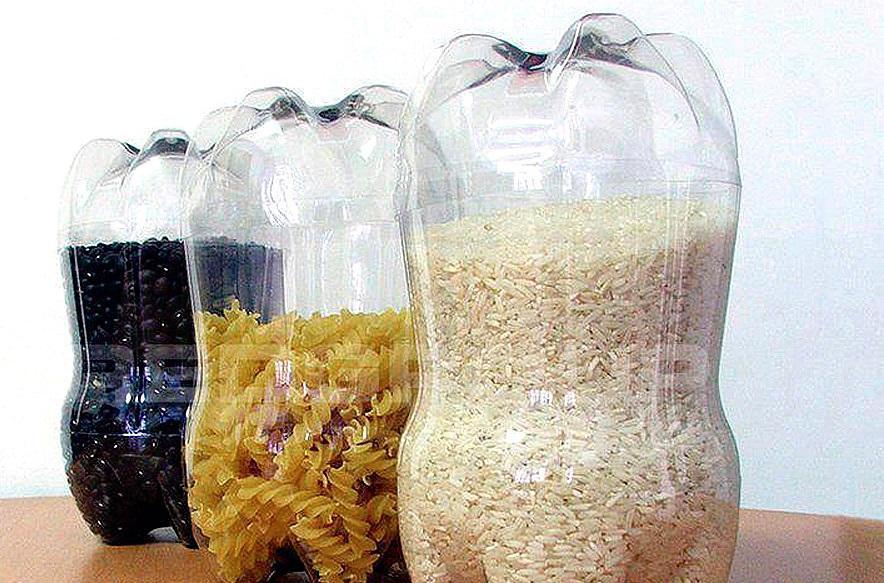 Estas garrafas também podem servir como recipientes para guardar a comida que temos na despensa. O arroz, a massa ou os legumes secos podem ser colocados nestas garrafas ao invés de estarem em suas respectivas embalagens. Para dar um toque mais original, em umComo propomos que faça isso como mostramos na imagem, ou seja, que corte duas garrafas pela metade aproveitando o fundo de ambas. Poderá usar uma metade para guardar a comida e a outra como tampa para proteger do clima e do pó acumulado.