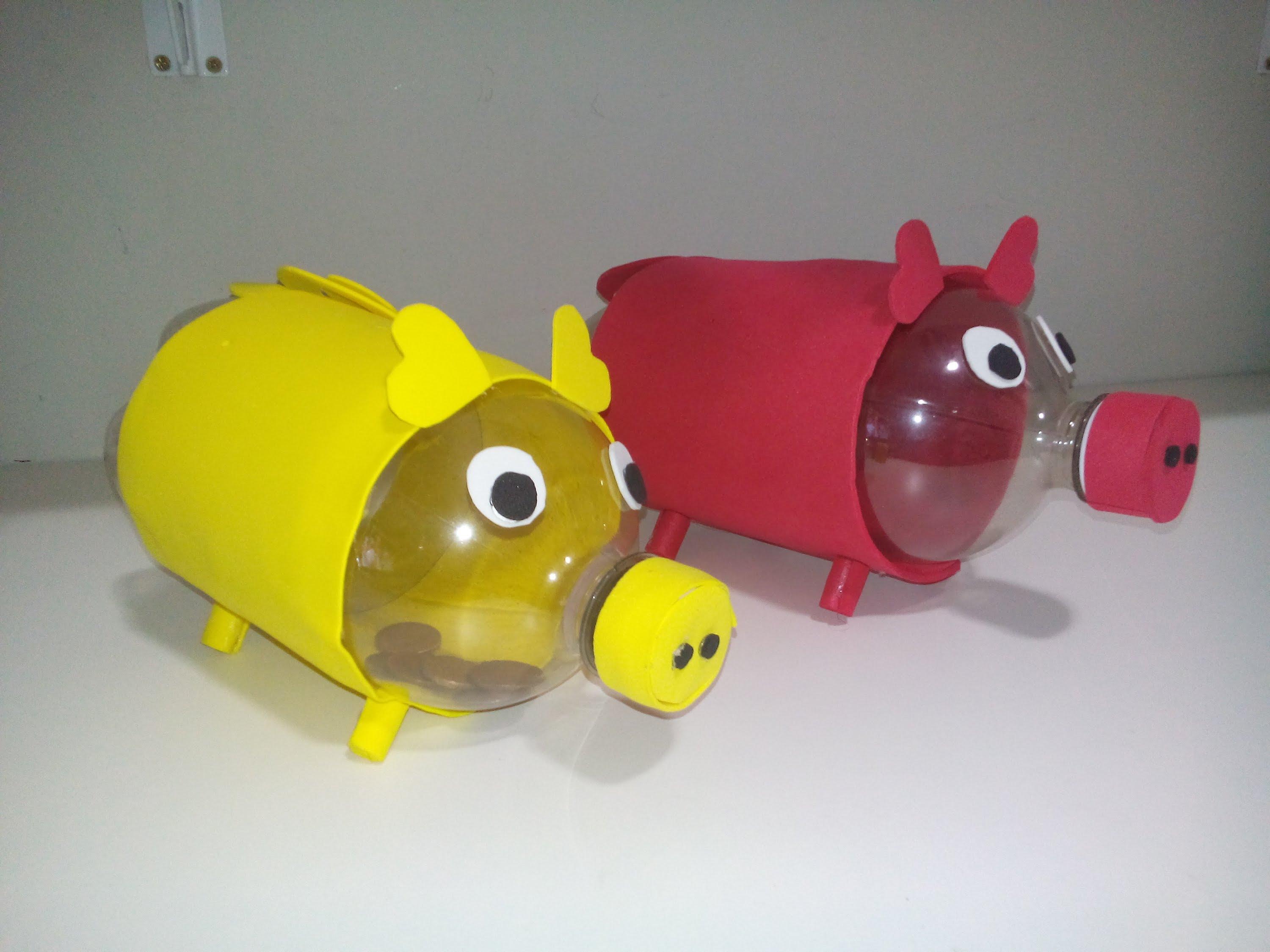 As garrafas pet já são famosas no meio dos artesanatos e reciclagem. Com uma garrafa pet de qualquer bebida, você pode fazer um carrinho divertido, levando bonequinhos em janelas feitas com cartolina para passear por qualquer lugar. Com as tampas de outras garrafas, faça o detalhes da roda e o carro está pronto para rodar. Ou, ainda, seguir a dica da imagem abaixo e fazer estes porquinhos divertidos.