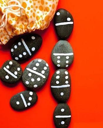 Sabe as pedrinhas mais polidas e grandinhas, tipo os seixos? Com um pouco de tinta branca, elas podem virar peças de um jogo de dominó para lá de criativo. Para fazer o dominó de pedrinhas, basta escolher as pedras mais ou menos do mesmo tamanho, lavá-las bem e, para finalizar, pintar o jogo de dominó com tinta branca ou pedra (dependendo da cor da pedra).