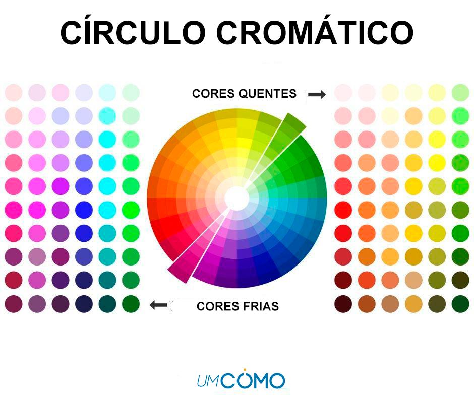 Nas diferentes imagens do círculo cromático que podem ser observadas por aí, geralmente você vai encontrar as cores quentes (ou seja, o vermelho e o laranja, além de seus tons intermediários) posicionadas à direita e, à esquerda do círculo, as cores frias (azul e verde) junto com seus tons intermediários.