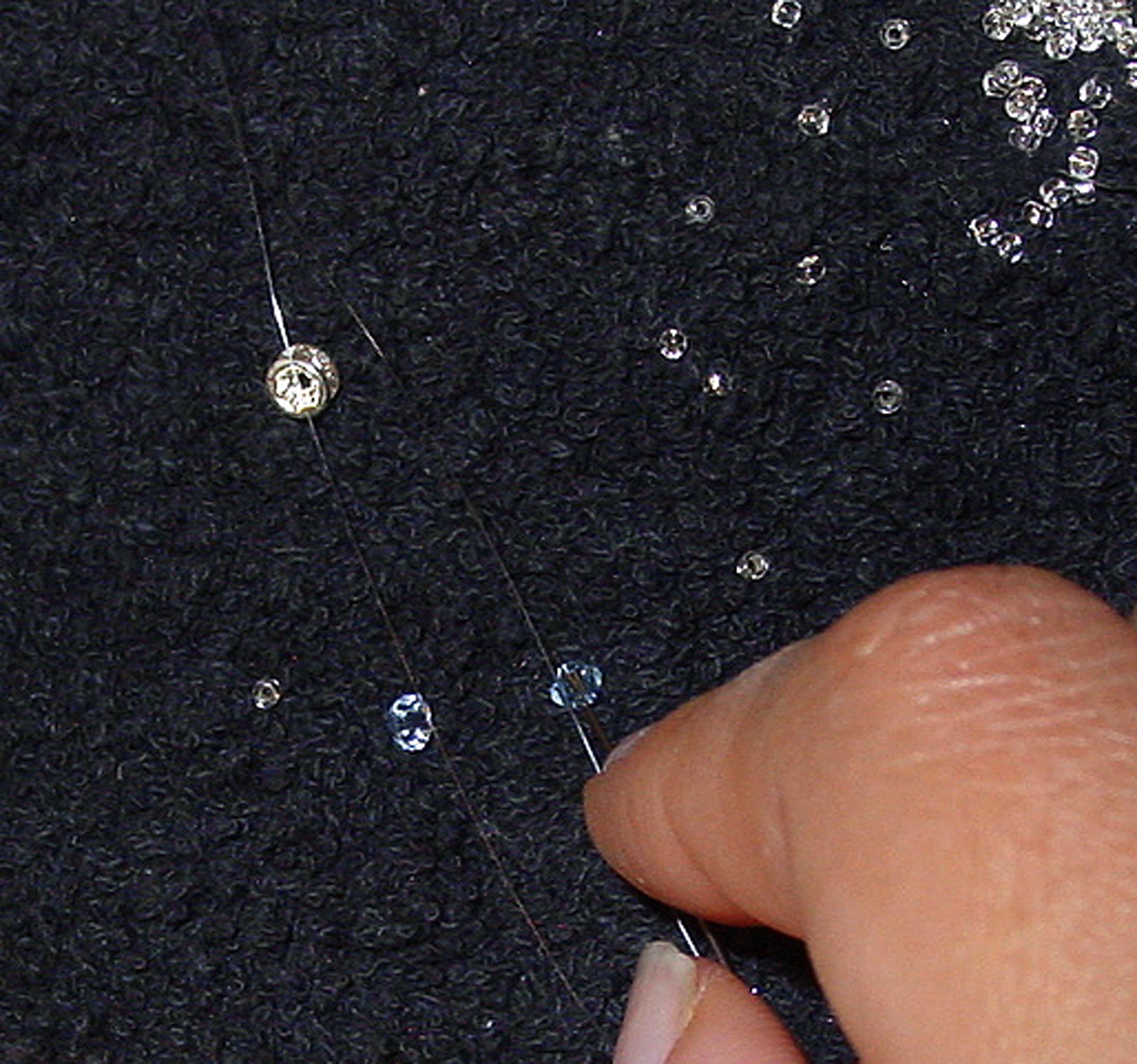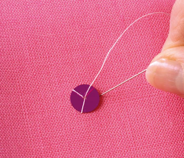 Atravesse o tecido com a agulha e passe-a pelo buraco no centro da lantejoula. Deixe sempre muita linha de sobra no outro lado do tecido.