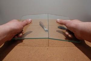 Agora você vai segurar o espelho pela borda e dar uma pequena e leve batida usando o cortador de espelho. Isso fará com que aquela pequena quebra do item anterior se separe da outra extremidade, criando, assim, duas peças.