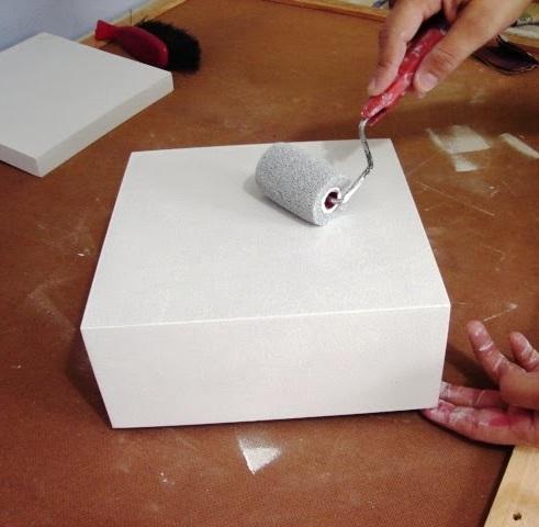 Pintar o mdf. Existe algum técnica na pintura do mdf de forma a conseguir um resultado homogêneo e uniforme. Em primeiro lugar comece por lixar ligeiramente a caixa, de forma a remover imperfeições e a fazer com que os produtos usados em seguida adiram melhor. Limpe com um pano úmido e, em seguida aplique massa corrida própria para madeira ou primer. Deixe secar e lixe novamente. Depois desses passos, finalmente pode aplicar a tinta própria para artesanato, com um pincel e depois com um rolinho, de forma a disfarçar as marcas do pincel.
