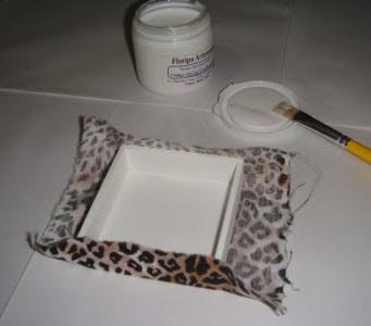 Aplicar tecido no mdf. Comece por pintar a caixa de mdf como indicado no ponto anterior e, quando estiver seca, passe uma cama de cola branca no local onde pretende aplicar o tecido. Em seguida Coloque o tecido bem alisado para que não fiquem bolhas. Deixe secar cerca de 20 minutos e, com a ajuda de um pincel, aplique termolina leitosa sobre o tecido. Deixe secar novamente e está pronta!