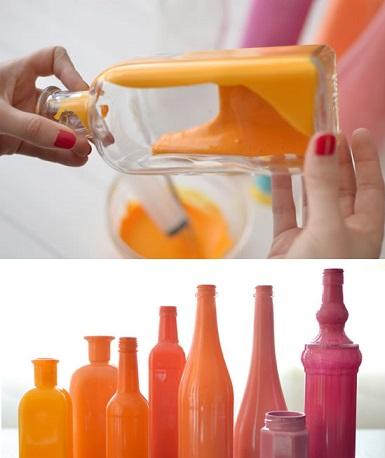 Se você quiser pintar as suas garrafas de vidro de uma só cor, existe um método bem fácil de fazer isso. Você vai precisar de tintas para vidro, uma seringa larga e um pote para misturar a tinta. Comece colocando no pote a cor da tinta desejada, se quiser também pode misturar cores e criar uma cor diferente. Agora com a seringa puxe a tinta e despeje na garrafa de vidro. Quando vir que já tem tinta suficiente dentro da garrafa para a cobrir, vá girando a garrafa de modo a que a tinta cubra toda a garrafa. No final, coloque a garrafa de cabeça para baixo em um recipiente que possa sujar com tinta e deixe secar.