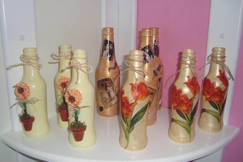 Antes de utilizar as garrafas de vidro, deve retirar os rótulos e limpá-las bem. Uma das formas de você decorar as suas garrafas de vidro é com barbante. Tudo o que você precisa é de barbante colorido e cola quente. Coloque um pouco de cola em uma parte da garrafa e vá enrolando o barbante ao redor. Você deve passar cola aos poucos, à medida que cobre a garrafa com o barbante. No final, com botões, linha ou outros acessórios, pode decorar a garrafa escrevendo alguma palavra utilizando mais de uma garrafa, como no exemplo da foto "love".