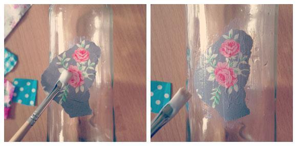Comece colocando cola no reverso ou parte posterior da imagem, coloque a imagem no lugar que quer da garrafa e depois cubra com cola, como se pintasse. Deve repetir esta ação com todos os desenhos que quer colocar na garrafa, inclusivamente pode cobrir toda a garrafa com vários papéis e posteriormente tem que passar mais uma camada de cola.