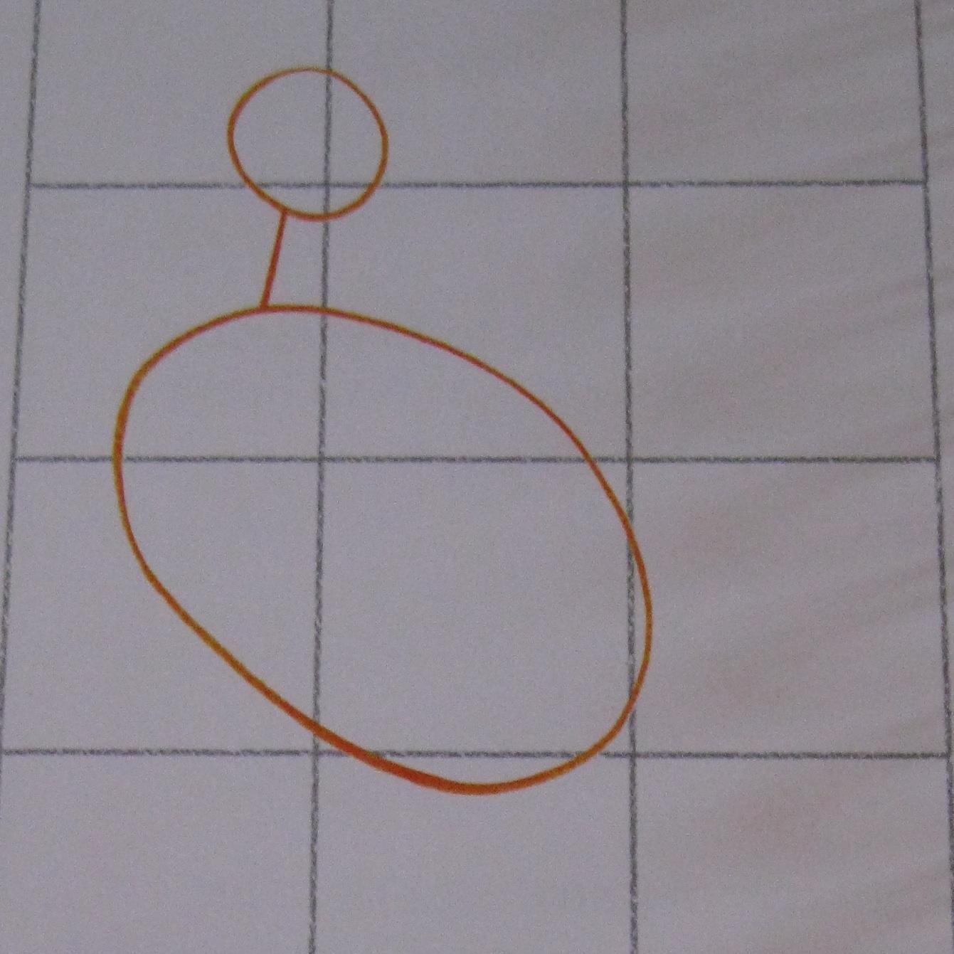 Desenhe uma grade com três quadrados iguais horizontais e quatro verticais. Em primeiro lugar desenhe a forma do corpo na grade. Faça logo a cabeça e una ao corpo com uma linha fina. Verifique que todas as formas do desenho estejam em seus lugares e avance até ao seguinte passo.