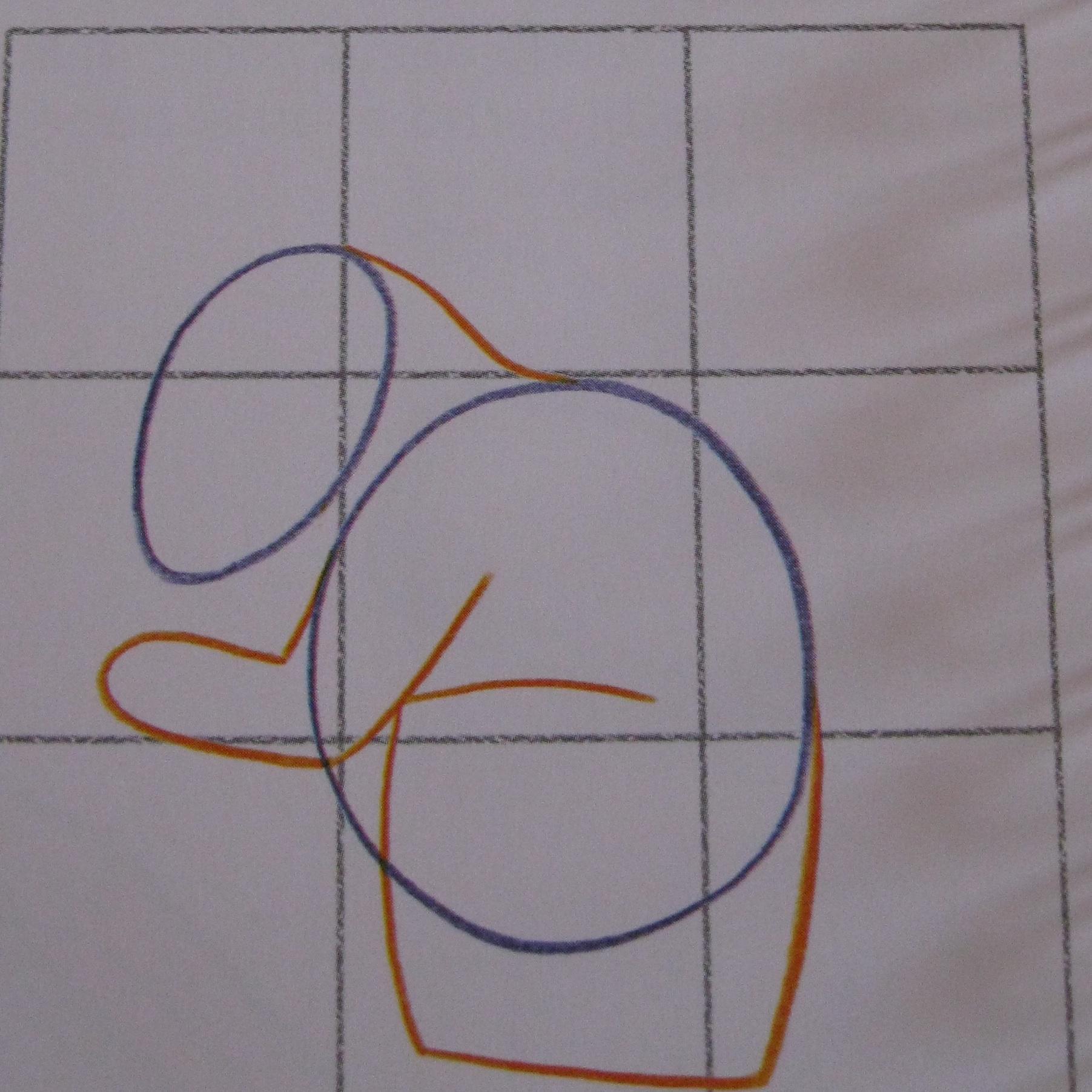 Una a forma da cabeça com a forma do corpo através de uma linha curva. Desenhe as patas dianteiras. Veja que as patas saem da borda do círculo superior. A forma quadrangular para as patas traseiras também saem da parte inferior do corpo. Verifique que seu desenho está bem feito e avance para o passo seguinte.
