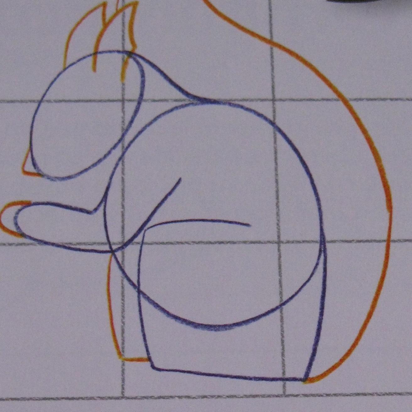 Aqui já temos as orelhas. São curvas e terminam em ponta. Desenhe uma pequena forma para o nariz e acrescente o extremo da outra pata por trás da primeira. Desenhe a outra pata dianteira. Esboce a longa e espessa cauda que se curva depois do corpo e se estende acima da cabeça e das orelhas.