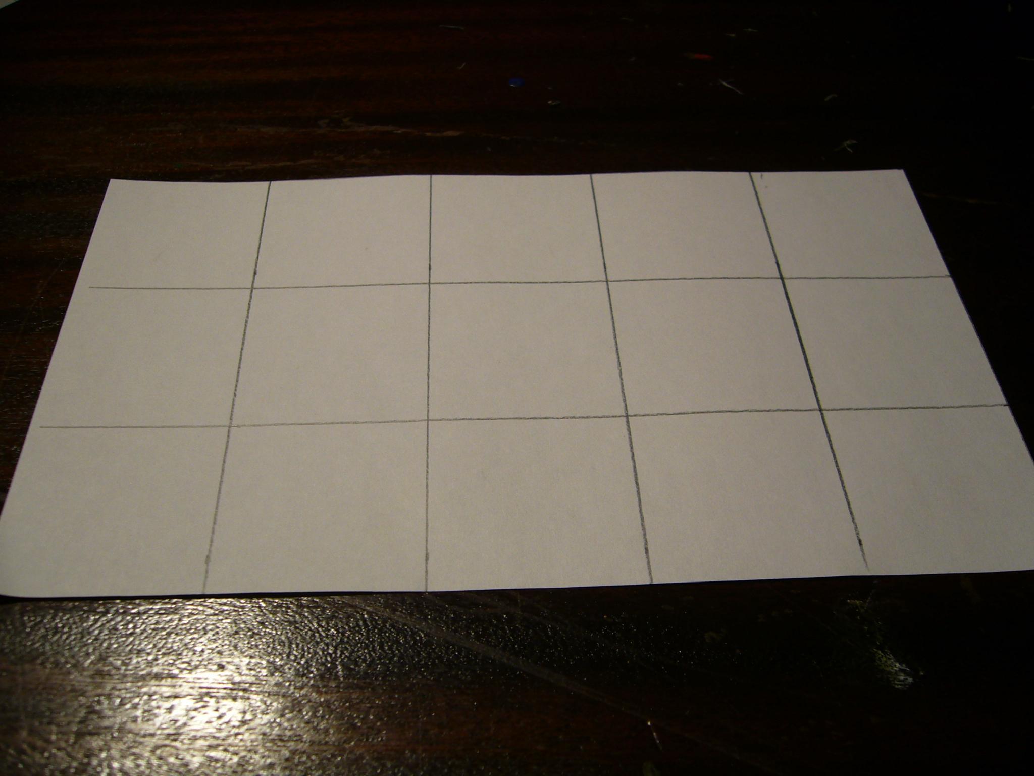 Faz uma grelha de 5 quadrados horizontais e 3 verticais. Os quadrados devem medir 4cm x 4 cm. Observa a imagem.