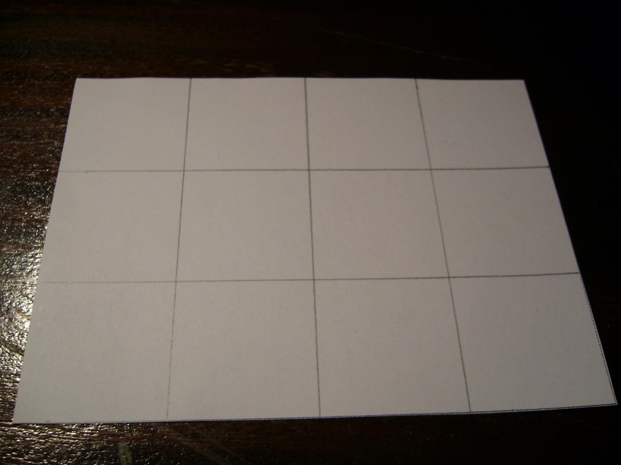 Para o desenho de caveira, faça uma tabela com 4 quadrados horizontais e 3 verticais. Os quadrados devem medir 4cm x 4cm. Observe a imagem abaixo.