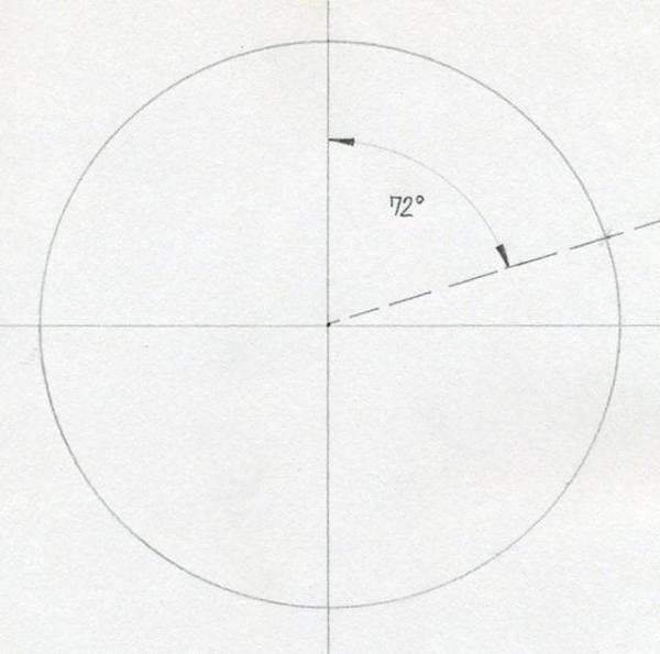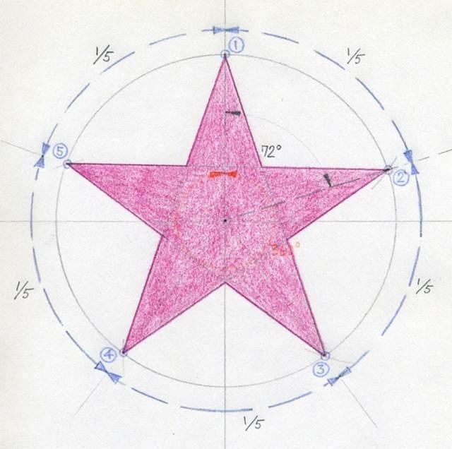 Usando um transferidor, marque um ângulo de 72 graus. O ponto de onde parte uma linha entre pontos do círculo é uma das 5 pontas da estrela.