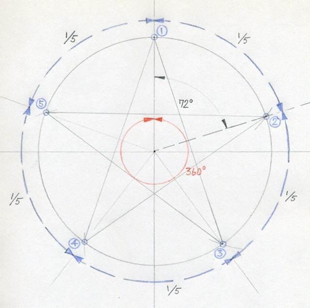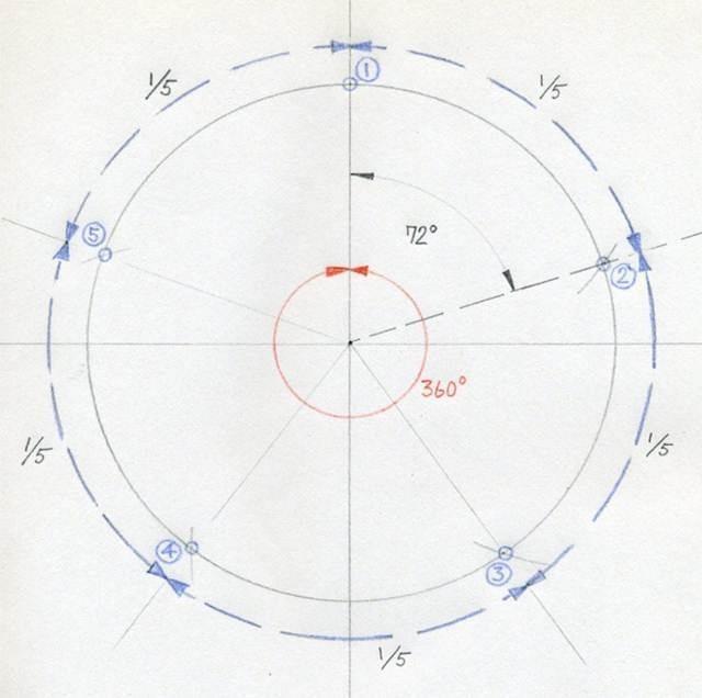 Você deve obter 5 pontas (1, 2, 3, 4, 5) com uma distância exata entre si. Em outras palavras, a distância entre cada ponto representa 1/5 da longitude da circunferência.