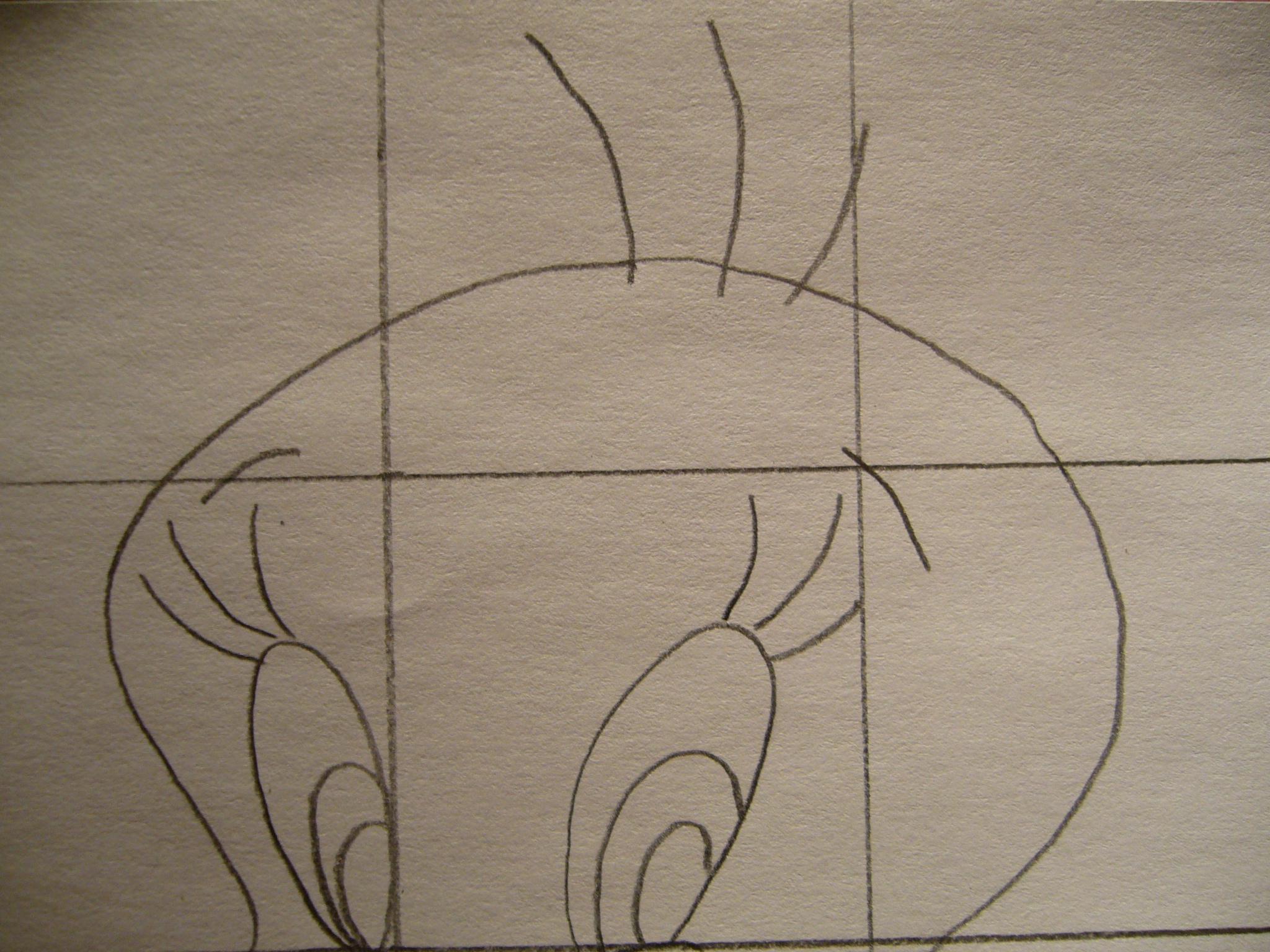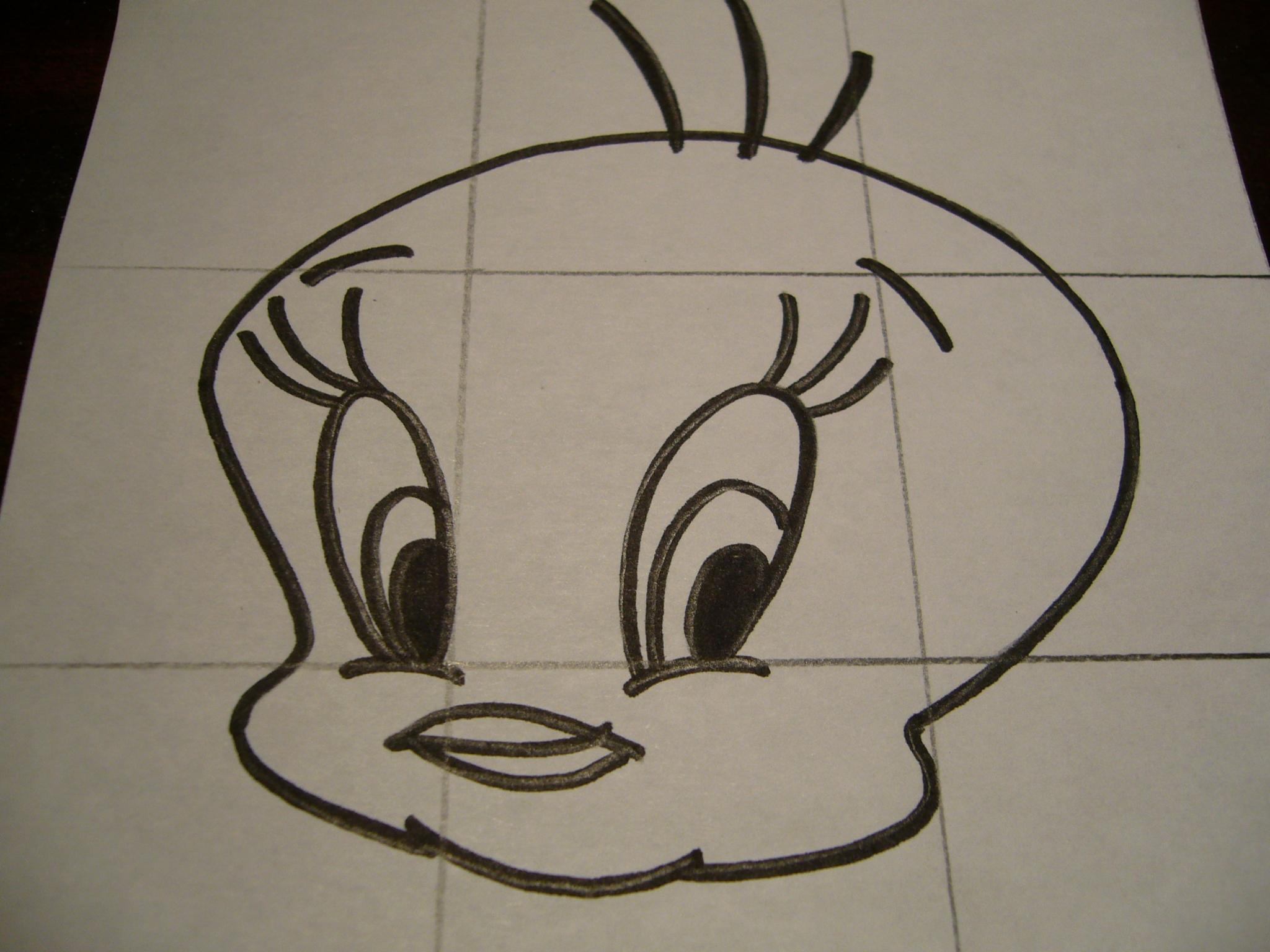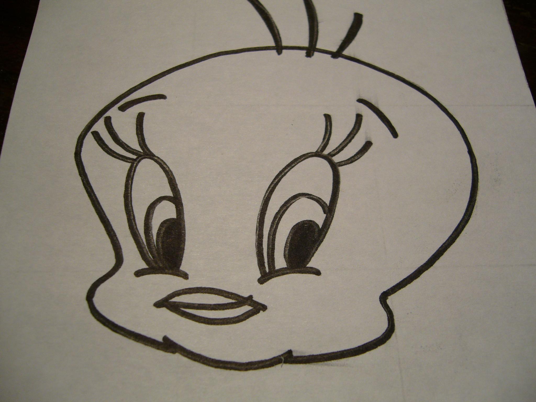 Comece por desenhar todo o contorno da cara do Tweety. Repare bem nas linhas do desenho da foto.