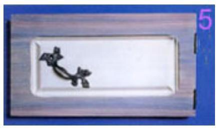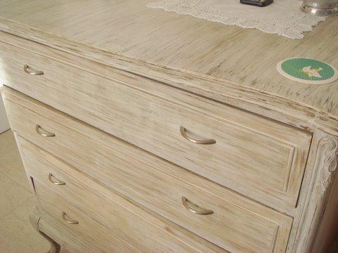 A seguir, sobre a goma-laca bem seca, aplique a cor creme (branco + terra siena natural + terra sombra natural) diluída apenas em água. Aplique também no móvel inteiro.