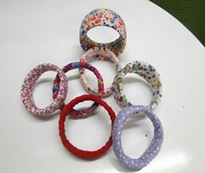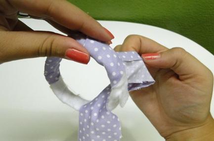 Depois é só começar a colocar os pedaços de tecido que escolheu, enrolando-os bem em torno da bracelete, certificando-se que estes estão bem colados e esticados. Você pode usar tecido, fita de cetim, corrente de pérola, etc.