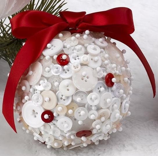 Bolas de Natal. Uma simples bola de isopor é a base para trabalhos muito criativos, desde cabeça de bonecos a bolas decorativas para colocar, por exemplo, na árvore de natal. Para fazer uma bola de isopor decorada como a da imagem ao lado simplesmente pegue em um botão, coloque um alfinete em um dos buracos do botão e fure o alfinete na bola de isopor. Repita o processo com outros botões e outros alfinetes até toda a área da bola estar preenchida.
