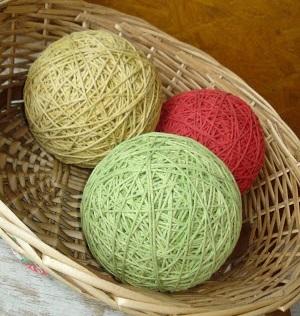 Bolas decorativas. Você pode fazer outras bolas de isopor decoradas para montar, por exemplo, um centro de mesa! Uma das técnicas a colocar em prática é enrolar cordel barbante em todo o redor da bola, em direções alternadas, até não ser visível a cor dela, e fixando-o com cola quente. Prefira usar cordel barbante colorido ou outro similar para um resultado mais variado.