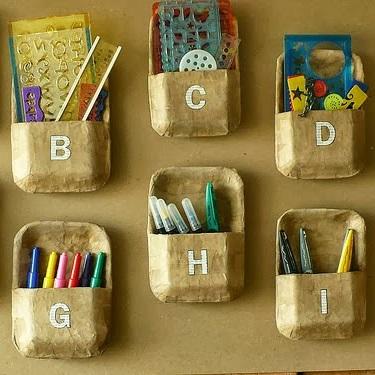 Organizador. Bandejas de isopor também podem ser usadas para organizar pequenos materiais da sala de estudo ou escritório. Para fazer o artesanato da imagem ao lado você irá necessitar de, pelo menos, uma bandeja mais metade de outra; usando cola branca, cole nelas recortes de papel pardo ou papel colorido, este passo criará uma textura interessante; depois basta colar ambas as bandejas com as laterais frente a frente, com cola quente, e pendurar na parede!