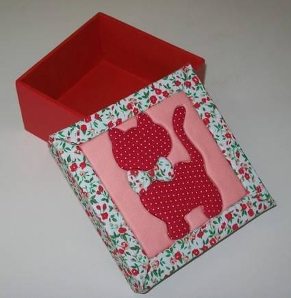 Patchwork. Um artesanato muito popular com isopor é o patchwork em isopor que, apesar de ser um pouco trabalhoso, resulta em algo muito bonito! Na tampa de uma caixa de MDF cole um pedaço de isopor, usando cola cascorez, corte o excesso nas laterais com um estilete, desenhe algo no isopor e, novamente com o estilete, vinque os contornos do desenho. Passe uma camada fina de cola de tecido e cole um tecido bem alisado; com um desmanchador de costura, marque os vincos, inserindo ligeiramente o tecido neles. Corte o excesso de tecido distanciado em 3 mm do vinco usando uma tesoura pequena, e insira os 3 mm de tecido no vinco, novamente usando o desmanchador de costura; repita em todo o contorno do desenho.