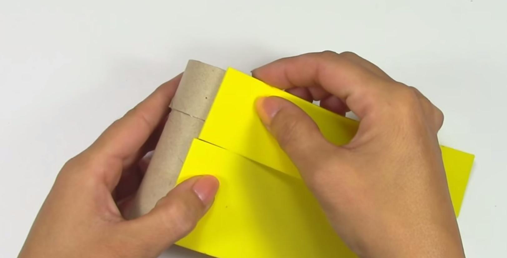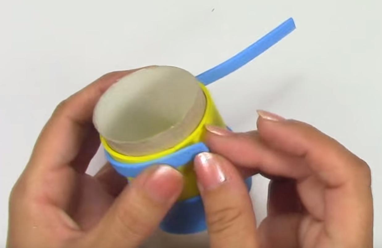 Por outro lado, terá que começar recortando um pedaço de borracha Eva ou Foam amarela, suficientemente grande para envolver ambos os pedaços do tubo de papelão. No entanto, será muito importante que na hora de enroscar não faça coincidir a borracha Eva com o papelão; no caso da tampa deverá deixar margem pela parte inferior do papelão, enquanto isso na base, a borracha deverá ficar mais curta que o papelão (ver imagem). O objetivo deste passo será conseguir que a tampa encaixe perfeitamente na base.