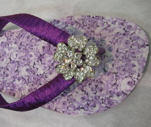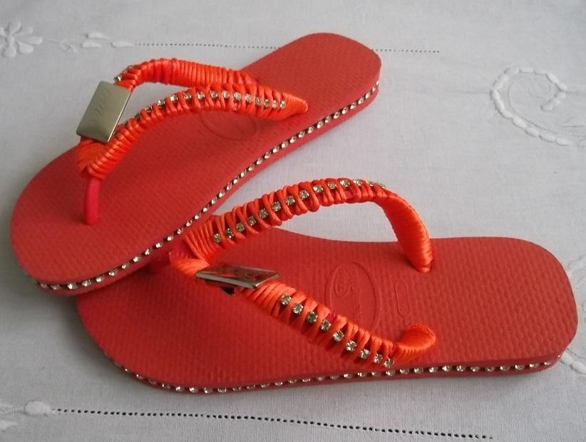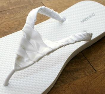Imagine como gostaria que eles fossem e escolha os elementos que farão parte dele. Fitas de cetim para enrolar em volta da alça do chinelo são uma boa opção! Além delas pode também escolher pequenas flores de tecido ou plástico e brilhantes, ambos os materiais permitem um infinito de opções de decoração.