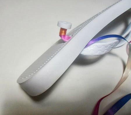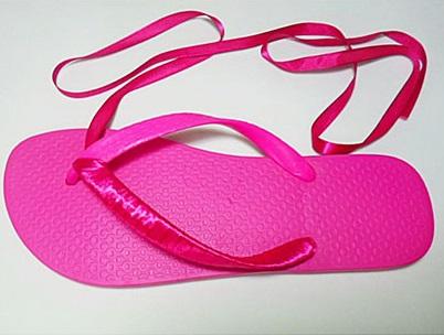 Peque no chinelo e, com a ajuda de uma faca, solte um dos pinos, aquele final de alça que fica presa na sola do chinelo. Cole uma das pontas da fita de cetim nele e comece enrolando-a, bem apertada, em volta da alça. Sobreponha a fita ligeiramente em cada volta, de forma a que não se veja a cor da alça. Termine no outro pino do jeito que fez no primeiro, soltando-o e colando a fita de cetim.