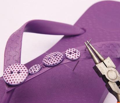 Alguns elementos deverão ser cosidos à fita de cetim em volta da alça do chinelo, enquanto que outros poderão ser colados com cola quente. Para elementos de tecido ou que tenha orifícios, como o caso dos botões, é preferível que os cosa com agulha e fio, de forma a mantê-los bem presas ao chinelo. Faça-o com a ajuda de um alicate, dado que o plástico do chinelo é grosso e poderá se magoar.