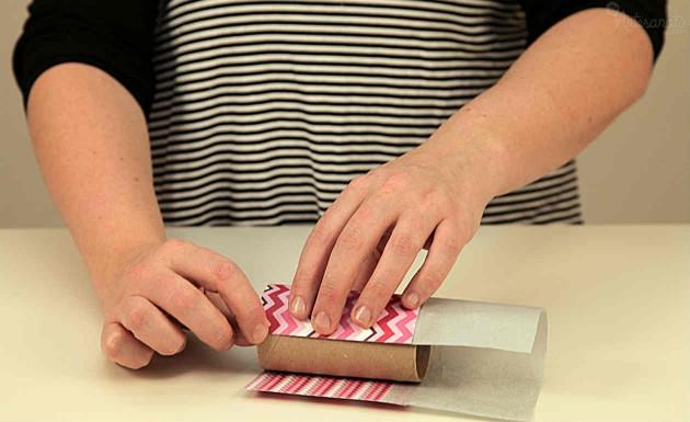 Vamos então começar por pegar no rolo de papel higiênico e forrá-lo com papel contact. Se preferir, pode forrá-lo com feltro, papel de presente, papel EVA ou tecido. Sugerimos o papel contact apenas porque é de mais fácil aplicação, uma vez que já contém cola.