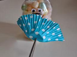 Pegue em uma forma de papel daquelas que usamos para doces como beijinhos e brigadeiros, dando preferência para formas estampadas e bastante coloridas. Coloque-as em cima da tampa da garrafa e puxe o papel para baixo de maneira a ficar com a marca da tampa na forma de papel. A forma de papel vai ser como um chapéu para o coelho da Páscoa e também vai servir para colar as orelhas dele. Retire a forma e abra uma fenda no topo do forma.
