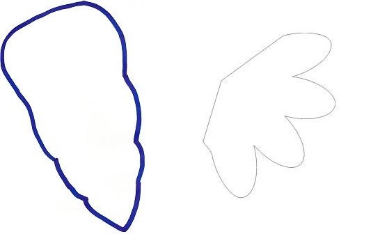 Agora vamos fazer uma cenoura para colocar no meio do coelho. Este passo é opcional, pelo que se não quiser pode passar ao seguinte. Utilize o molde ao lado e recorte em EVA laranja a parte azul da imagem e em verde a parte da folha da cenoura. Depois cole com cola quente a folha à cenoura.