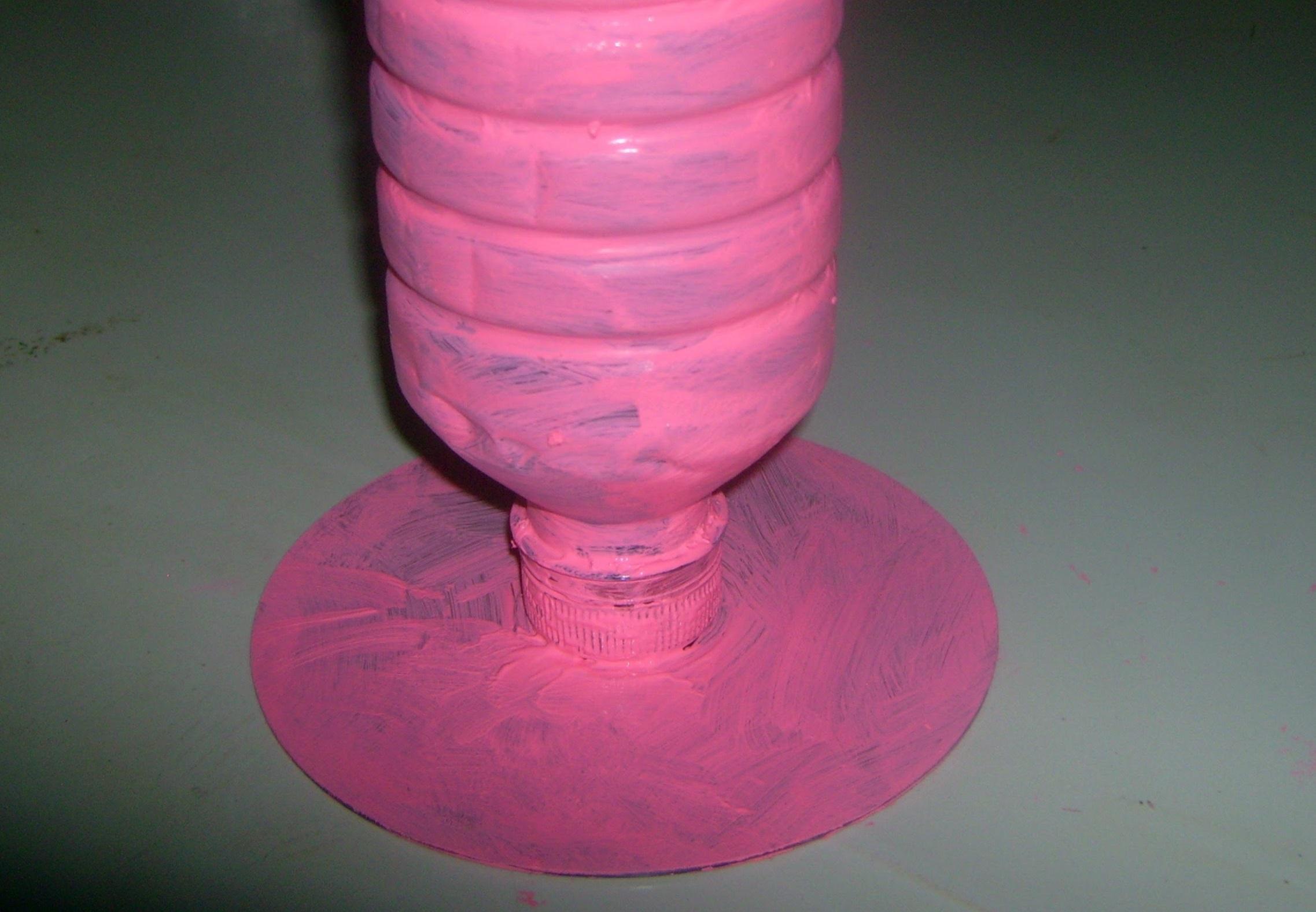 Enquanto os cartão e os tubinhos de papel higiênico secam, pinte toda a garrafa PET com a tinta rosa (incluindo a tampinha, que vai fazer de nariz do porquinho). Deixe secar também e, se necessário, passe outra demão de tinta até a cor ficar bem sólida e opaca.