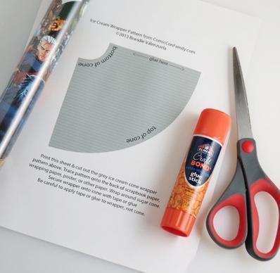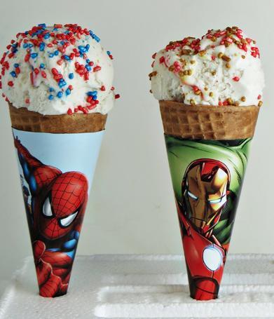 O que temos que fazer é muito fácil. Após recortar o modelo, o usaremos para recortar o papel dos super-heróis com o mesmo tamanho do modelo para fazer os cones. Verá que é muito fácil e seus filhos ficarão surpreendidos com os desenhos dos cones. Como mostrado na foto, você pode terminar a decoração do sorvete com um pouco de chocolate colorido.