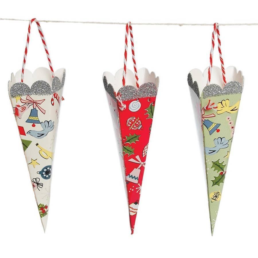 Os cones de suspensão são super original e muito fácil de fazer, se levarem pouco peso podem ser presos com cola e se pesarem mais, será preciso fazer um pequeno buraco no cone e puxar fios, faça um nó no outro lado. Esta decoração de cone é ideal para o Natal ou festas infantis, onde queremos pendurar coisas.