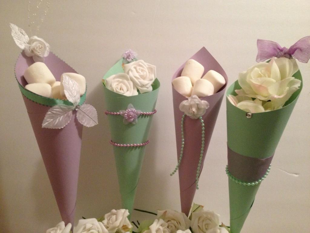 Cones para casamentos são também um complemento que pode ficar muito bem em um casamento elegante. Como pode ver na imagem, usaremos tonalidades pastel e sempre material de cartolina para fazer o cone, podemos terminar o cone com alguma decoração branca ou creme.