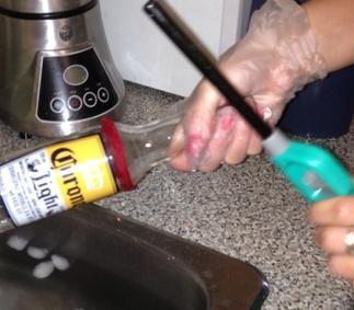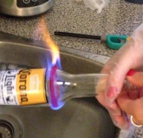 Agora vem o momento da verdade. Pegue a garrafa de coronita ou cerveja pela ponta, na outra mão um acendedor de cozinha, longo, não use isqueiro. Continuaremos a acender o fio de lã. Fazemos tudo isto sobre o tanque cheio de gelo.