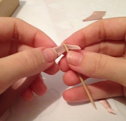 Dobre a ponta da fita e coloque sobre ela um palito de dente - isto irá ajudá-la no processo -, comece enrolando a fita.