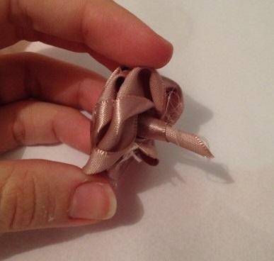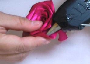 Quando a flor tiver o tamanho pretendido ou você tiver esgotado o comprimento da fita, cole a ponta escondida na flor utilizando cola quente.