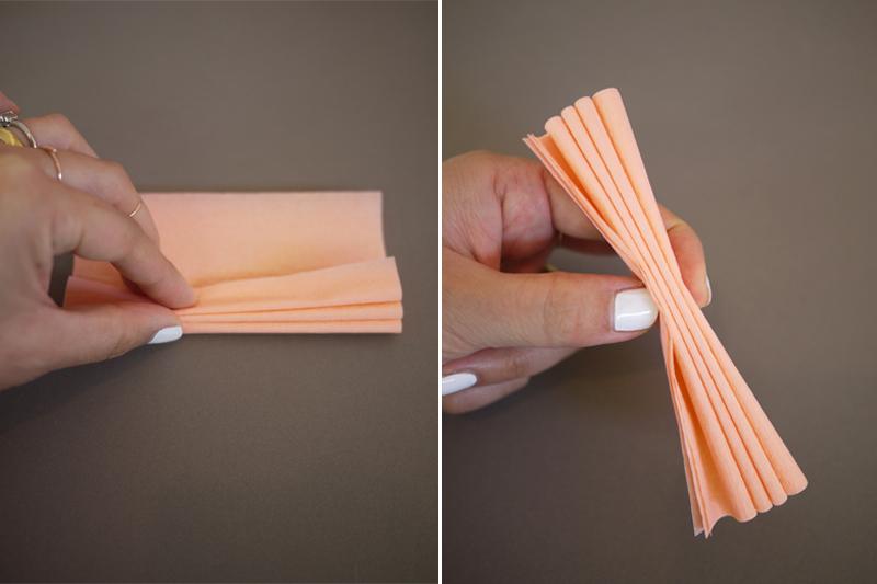 Agora pegue na tesoura e corte as duas pontas desse leque de forma arrendondada. Ao fazer isso, estará dando forma às pétalas da sua flor de papel crepom.