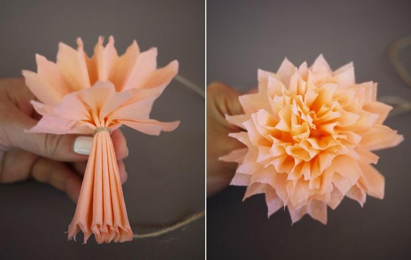 Comece a separar cada uma das folhas do papel crepom para trás, para dar forma à sua flor. É importante que faça isso com muito cuidado, caso contrário corre o risco de rasgar o papel. Faça isso dos dois lados do fio de nylon ou barbante e já tem a sua flor de papel crepom pronta! Uma ideia super legal para decorar a sua casa é fazer várias destas flores, de diferentes cores e amarrar a um pedaço de barbante, de forma a ficar com um cordão de flores.