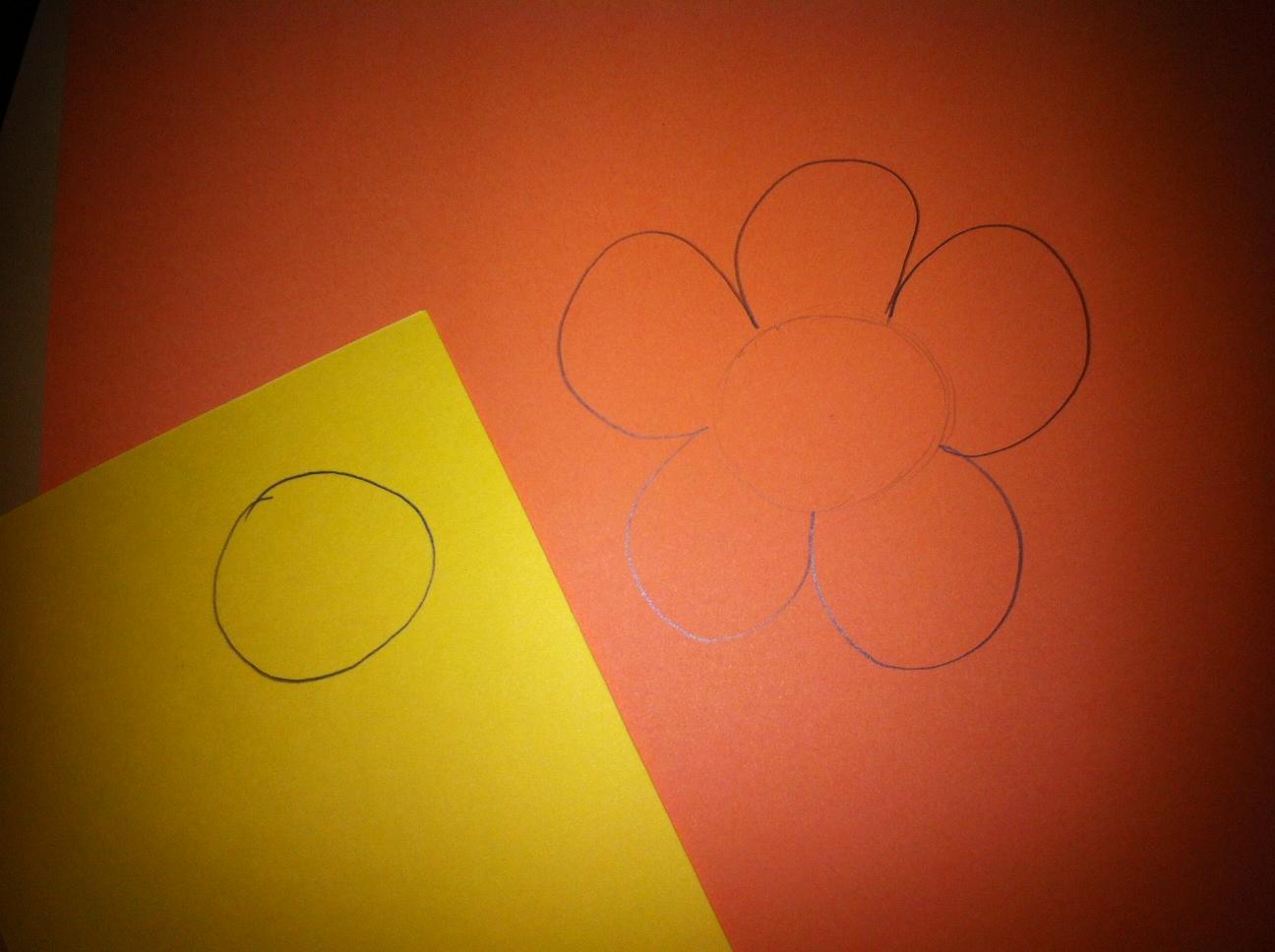 Desenhe em uma cartolina de cor as pétalas de uma flor. Para que seja mais fácil, desenhe primeiro o centro da flor com um lápis bem fraquinho e depois faça as pétalas. Em outra cartolina de cor diferente, desenhe o centro da flor.