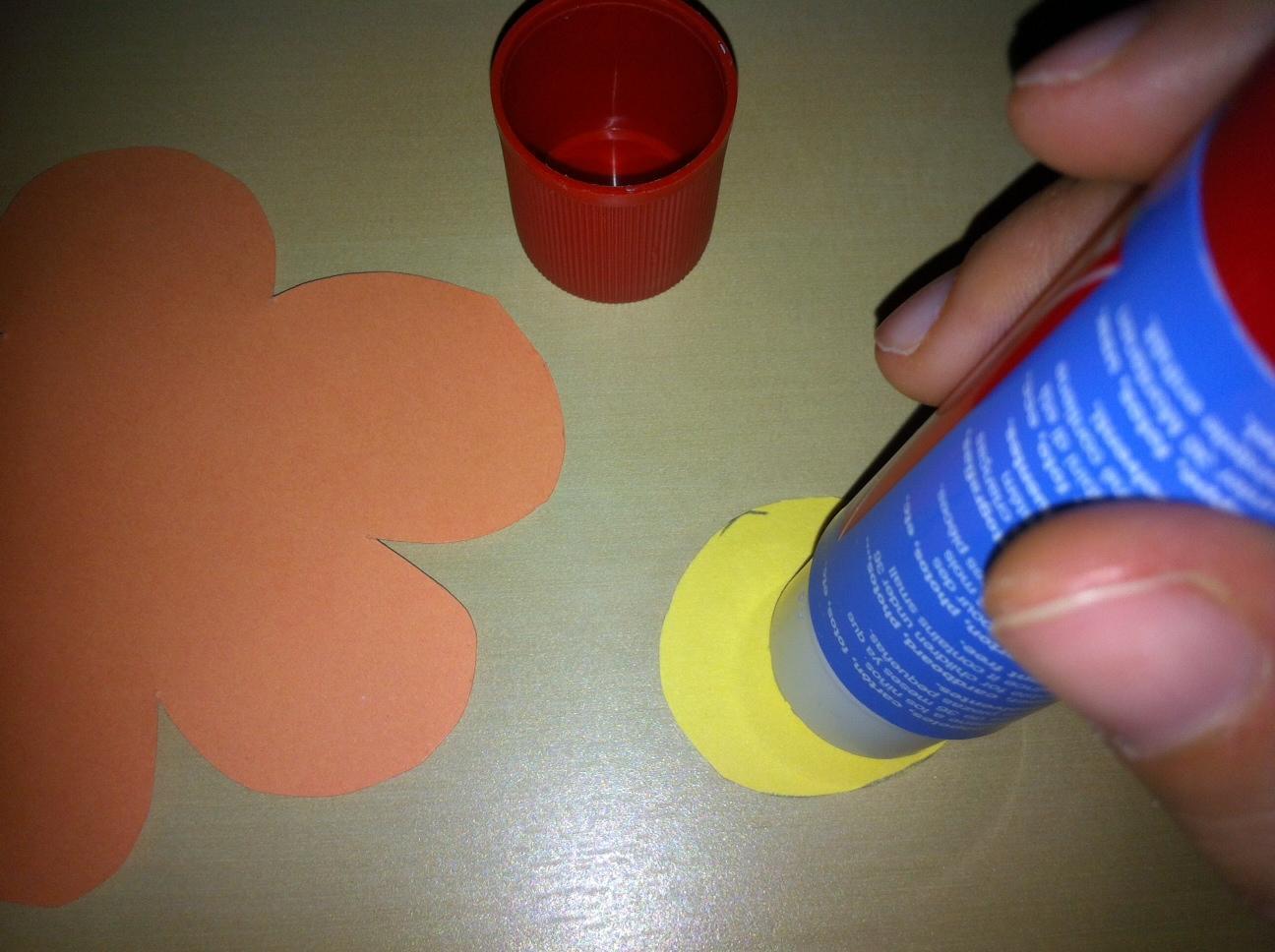 Ponha um pouco de cola de barra na parte central da flor e cola no centro.