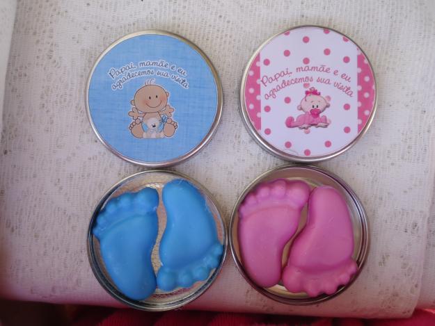 Uma ideia bem legal e original é fazer pezinhos de bebê em sabão! É só encontrar um molde em forma de pé, ou, se preferir, com outro motivo como mamadeira, chupeta, lacinho, etc.