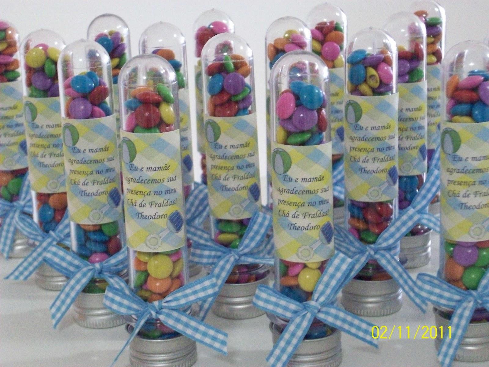 É uma lembrança super fácil e rápida de fazer: é só encontrar tubos de ensaio, enchê-los com a sua guloseima preferida, tampá-los e, no final, colocar uma etiqueta com uma lembrança escrita e um lacinho bem bonito.
