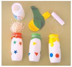 Antes de mais nada você deve encher as embalagens com pequenas quantidades de diferentes elementos: grãos-de-bico, arroz, açúcar....se preferir pode colocar pedras pequenas, pequenos pedaços de metais. O que você quiser sempre que sejam pedaços pequenos e que quando batam façam barulho.