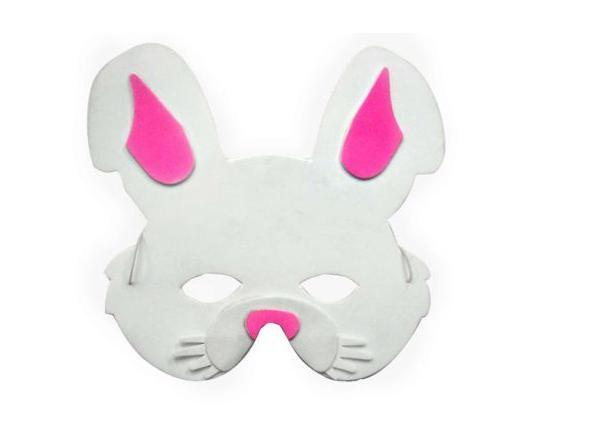 Façam uma máscara de coelho para celebrar a Páscoa, a primavera ou até mesmo para o carnaval. Precisará de um prato de papel, papel de construção de cor rosa e branco, tesoura, cola, um marcador, limpadores de cachimbo, elástico e um pompom grande.